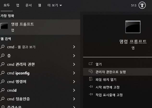 1. 키보드에서 윈도우 로고키를 눌러 검색바에 'cmd'를 입력 하시고 "관리자 권한으로 실행"을 합니다.
