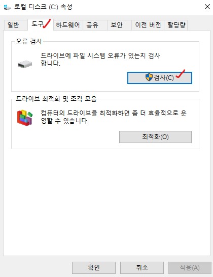 3. 오류 검사 창이 나오면 드라이브 복구를 진행하여 윈도우에서 오류를 찾아 문제를 해결합니다.