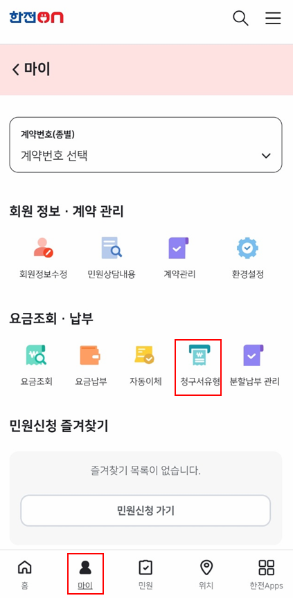 화면 중단에 '요금조회 - 납부' 항목이 있는데 이 중 '청구서유형'을 탭해주세요.