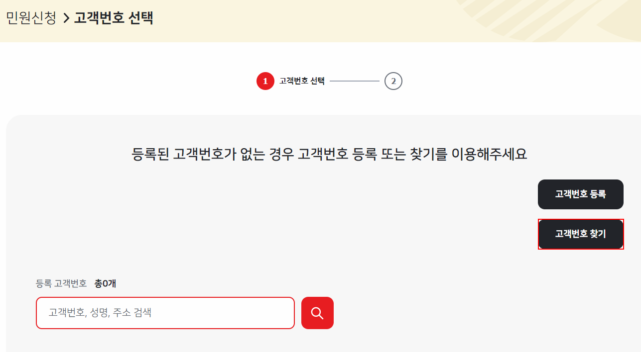 이동된 화면에서는 우측에 '고객번호 등록'과 '고객번호 찾기'가 보입니다.
