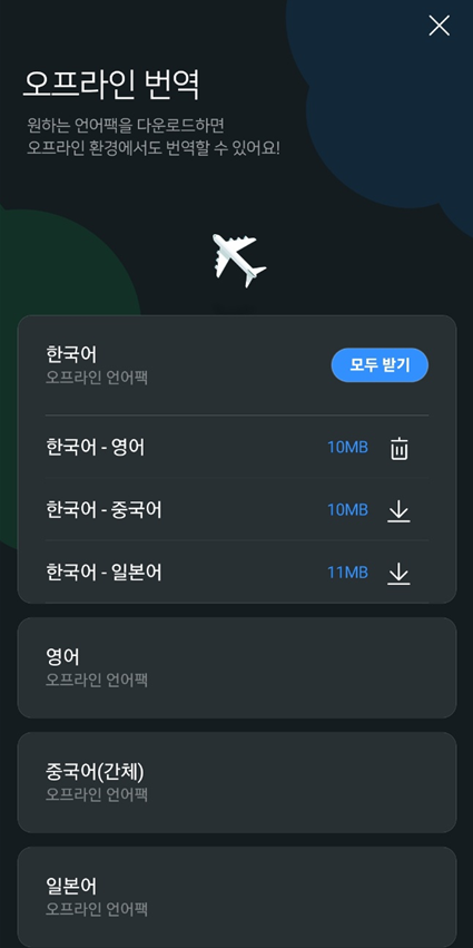 원하는 언어팩을 다운로드해서 네트워크 연결이 안된 상태에서도 파파고를 이용 가능합니다.
