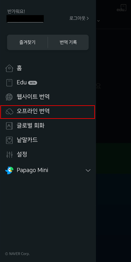 이렇게 메뉴창이 나옵니다. 여기서 '오프라인 번역'을 탭해봅시다.
