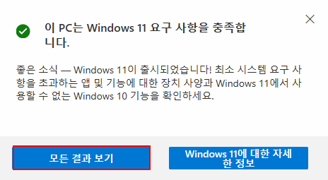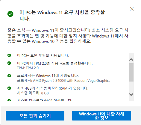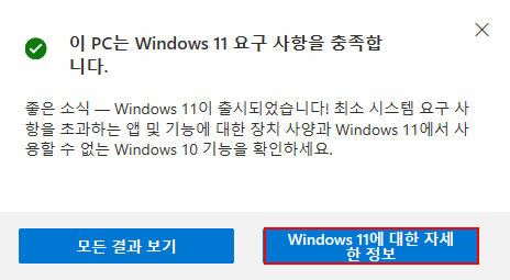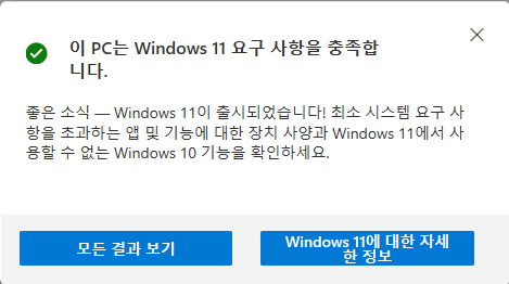 윈도우11 요구 사양 조건들을 모두 충족하는 경우엔 위와 같이 나오고,