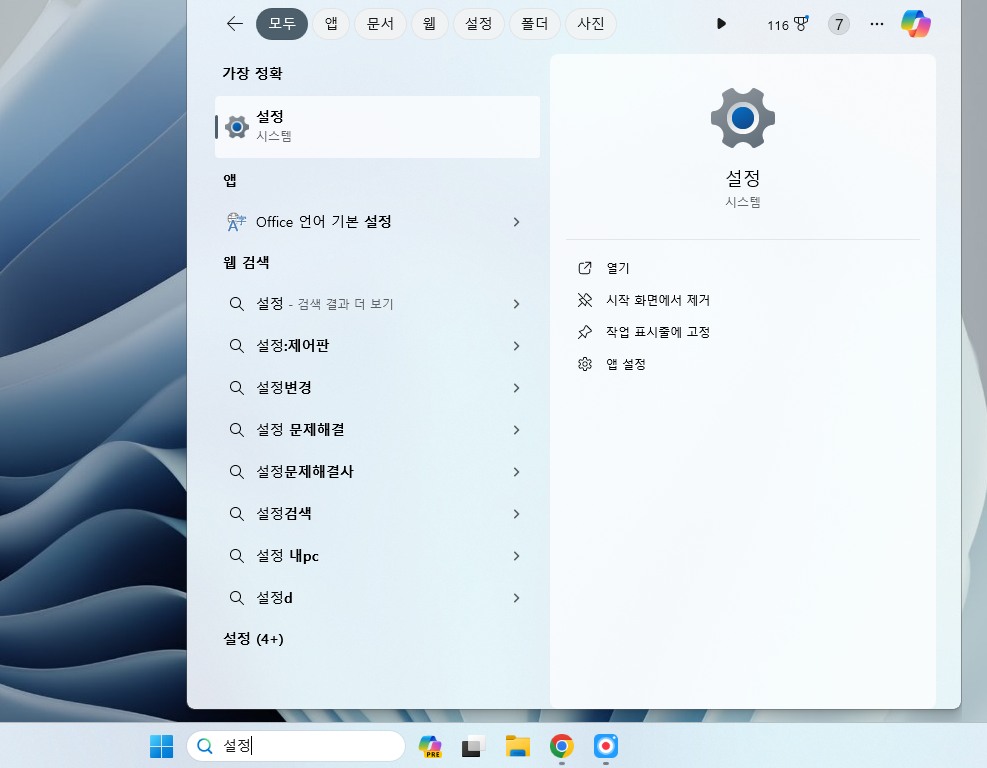 - 키보드 Windows 키 + I → 설정 열기 또는 검색창에 '설정' 입력 → 클릭