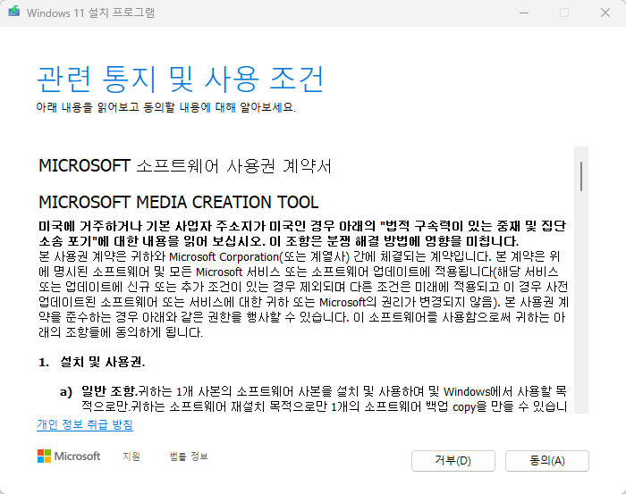 해당 내용에 동의를 해야만 설치가 가능하기에 '동의(A)' 버튼을 클릭합시다.