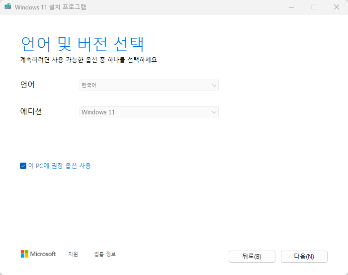 언어는 원하는 것으로 설정하시면 되고, 에디션은 'Windows 11'밖에 없습니다.