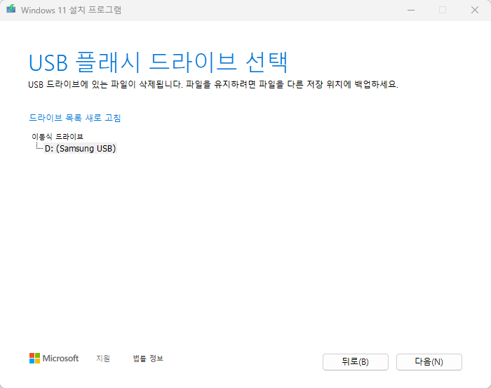 그리고 윈도우11 부팅디스크를 설치할 USB를 선택하게 됩니다.