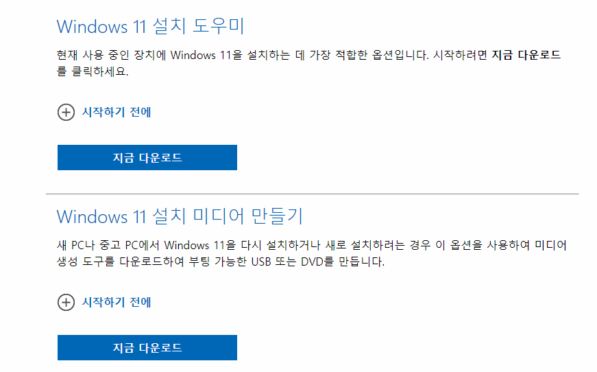 'Windows 11 설치 미디어 만들기' 항목의 '지금 다운로드'를 클릭합시다.