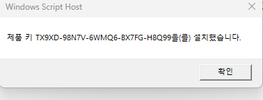 방금 입력한 코드의 제품키를 설치했다고 나옵니다.