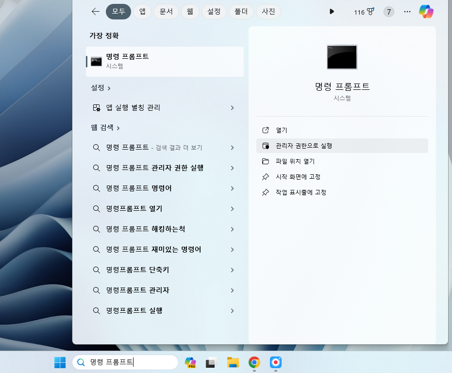 그리고 '관리자 권한으로 실행' 탭을 클릭해서 열어주세요.