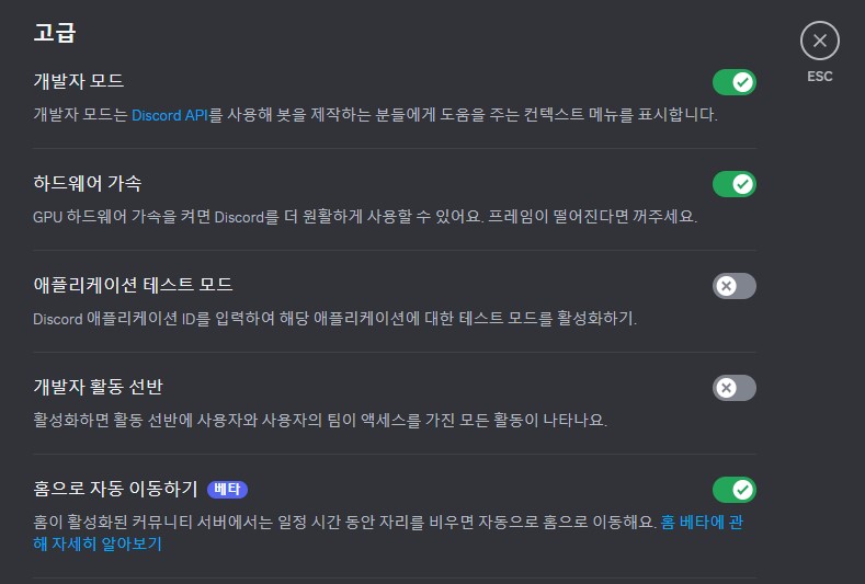 하드웨어 끄는 방법은 디스코드 설정에 들어가셔서 고급 설정 부분에서 끄실 수 있습니다.