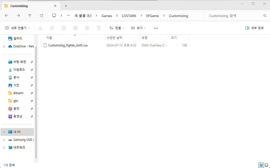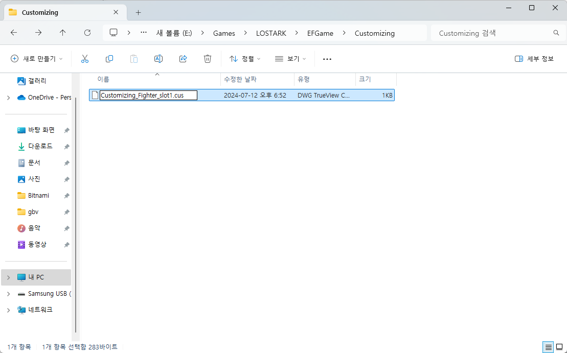 'C드라이브 > Program files (x86) > Smilegates > Games > LOSTARK > EFGame > Customizing'