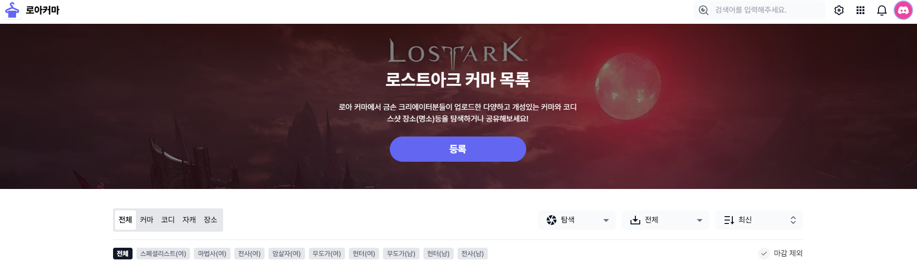로스트아크 커마/룩/코디/자캐/장소 등을 로아커마에서 필터를 통해 획득하고 공유해보세요!