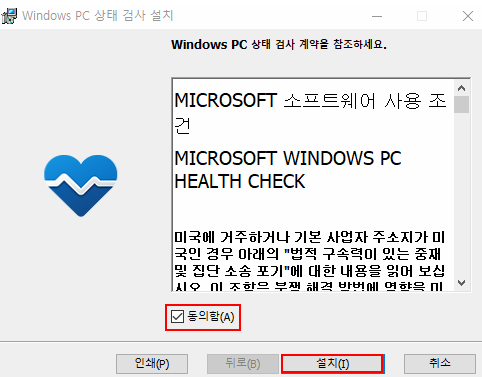 '동의함(A)'에 체크하고 하단의 '설치(I)' 버튼을 클릭합시다.