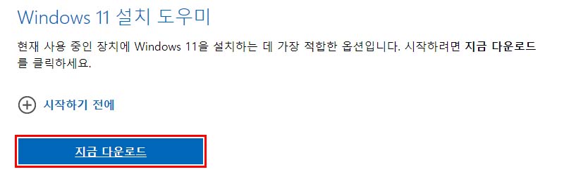 그리고 상단 'Windows11 설치 도우미' 항목에 있는 '지금 다운로드' 버튼을 클릭해주세요.