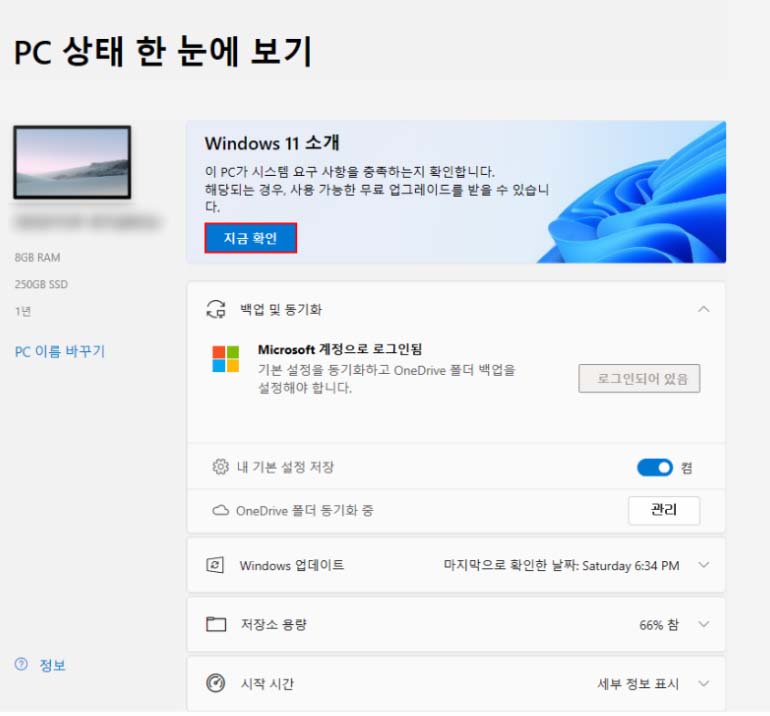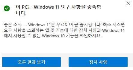 위 사진과 똑같이 '이 PC는 Windows 11 요구 사항을 충족합니다.'라고 나와야 합니다.