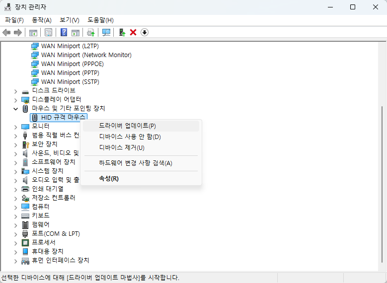 그리고 해당 항목을 열고 세부장치에 우클릭을 해서 '드라이버 업데이트(P)'를 클릭합시다.