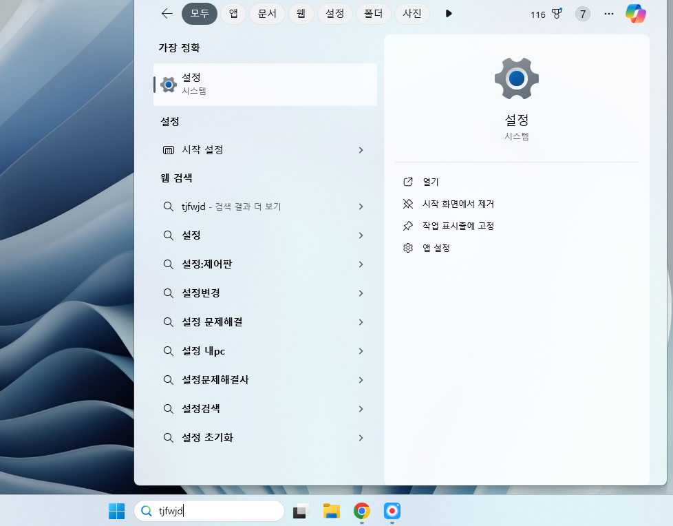 윈도우 하단 검색창에 '설정'이라고 입력을 해주세요.