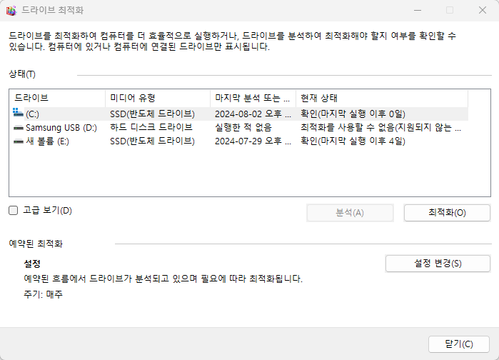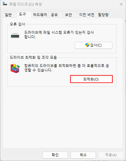 해당 옵션을 통해서 드라이브를 선택해서 최적화 작업을 하는게 가능합니다.