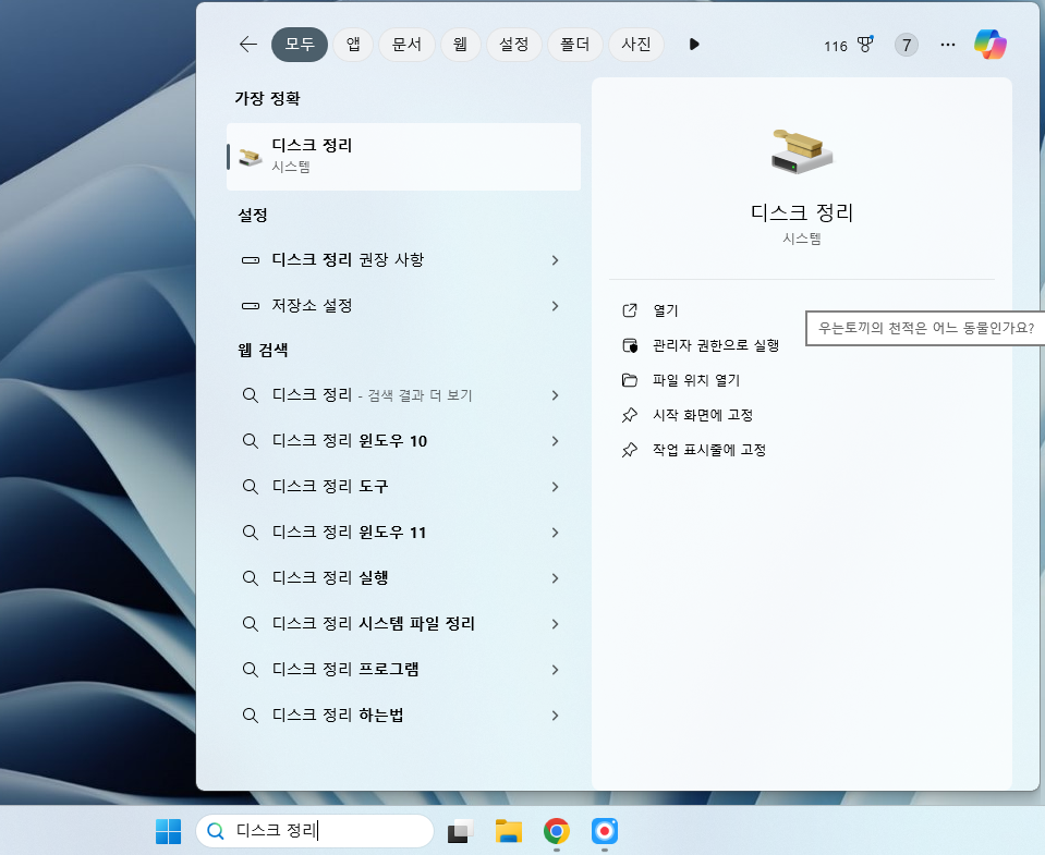 화면 하단을 보면 윈도우 검색창이 보이죠. 거기에 '디스크 정리'라고 검색합시다.