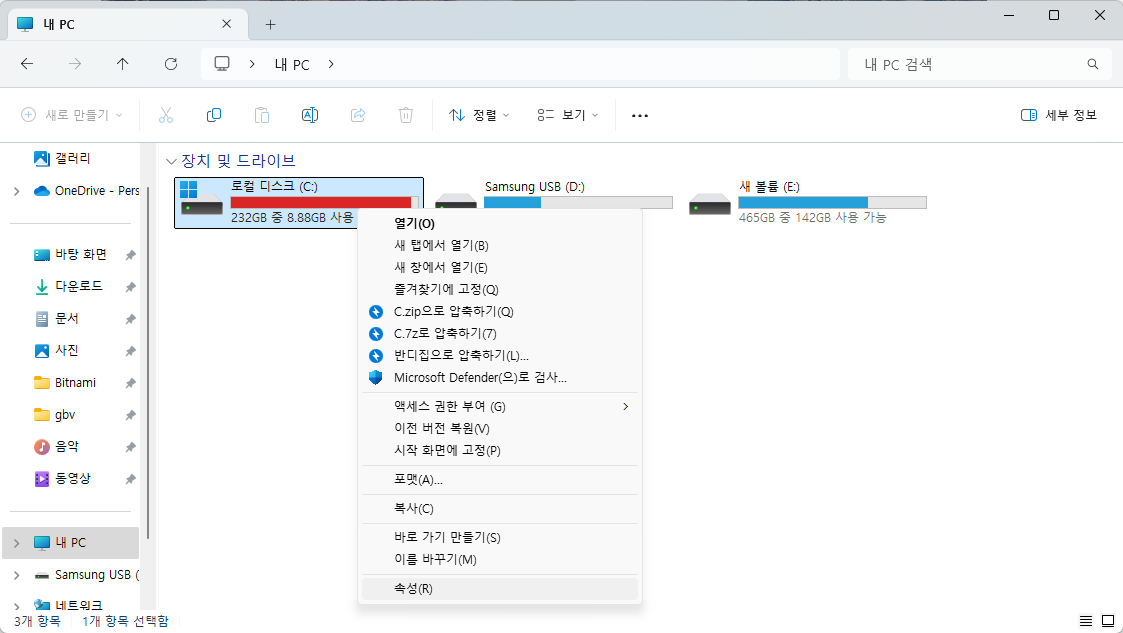 그리고 windows 이전 버전의 old 폴더가 있을법한 드라이브에 우클릭해주세요.