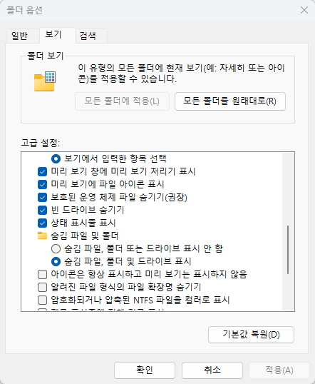 그러면 이런 식으로 폴더 옵션 창이 나오게 됩니다.