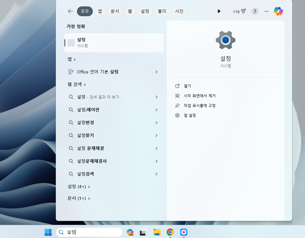 우선 이렇게 하단 윈도우 검색창에 '설정'을 입력하고,
