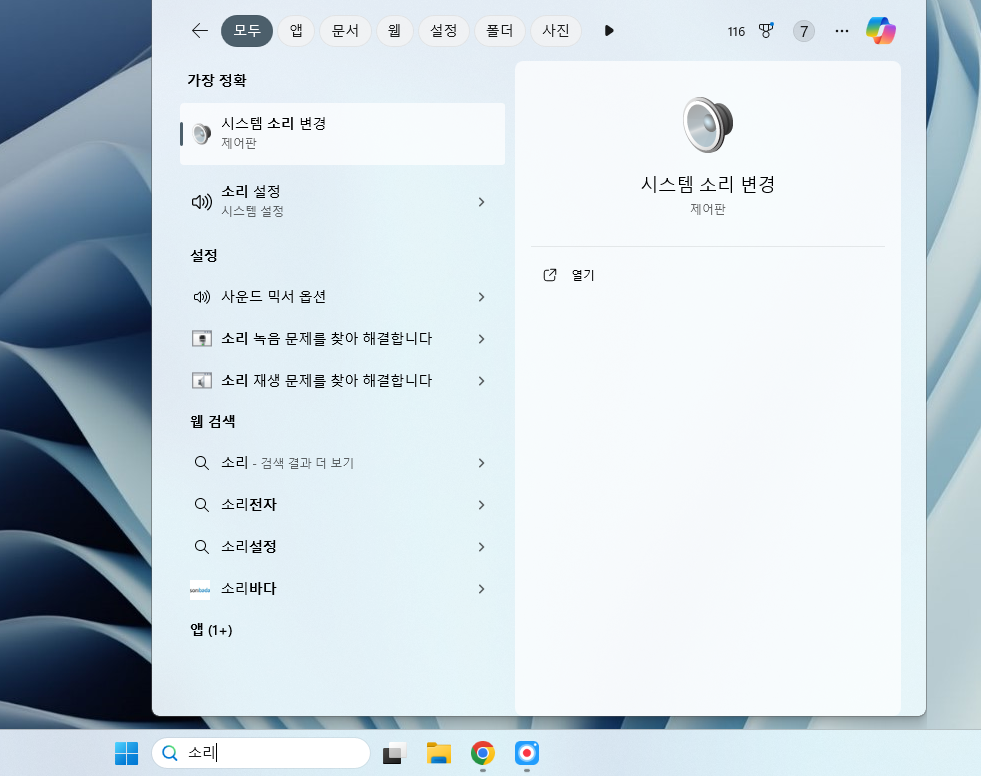 마지막으로 화면 하단에 있는 윈도우 검색창에 설정이 아닌, '소리'라 입력해봅시다.