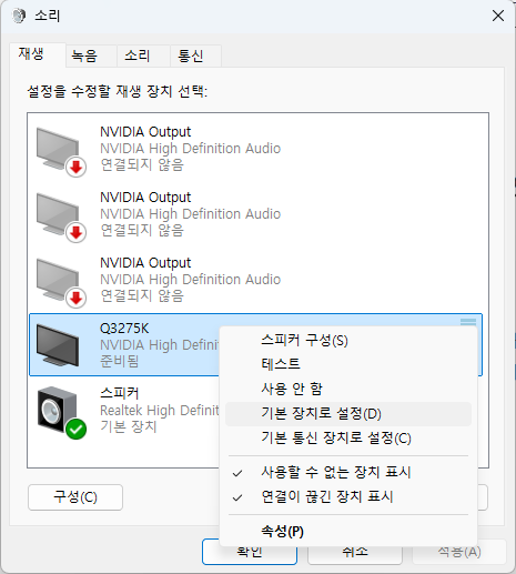 그러면 해당 장치가 기본 사운드 출력 장치로 설정되면서 정상적으로 소리가 나올 겁니다.