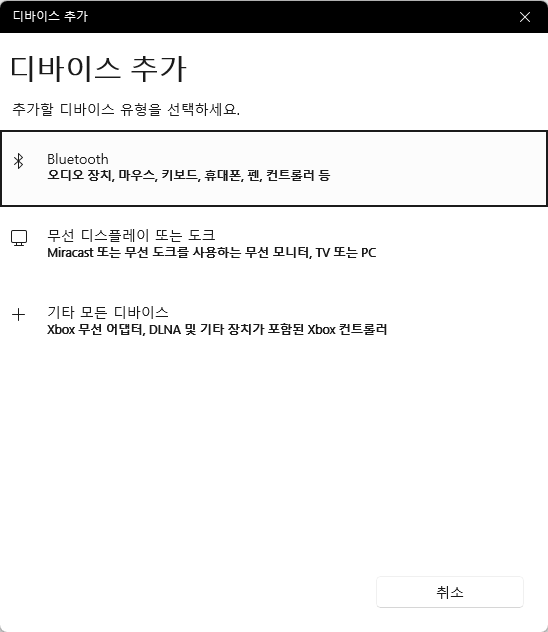 바로 컴퓨터의 기기 설정에 들어가서 블루투스 연결 시도를 해보는 겁니다.
