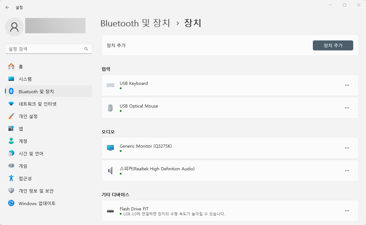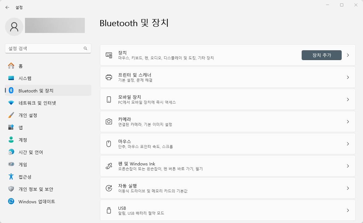 이렇게 해서 설정 창이 나오면 좌측에 있는 'Bluetooth 및 장치' 항목을 클릭해주세요.