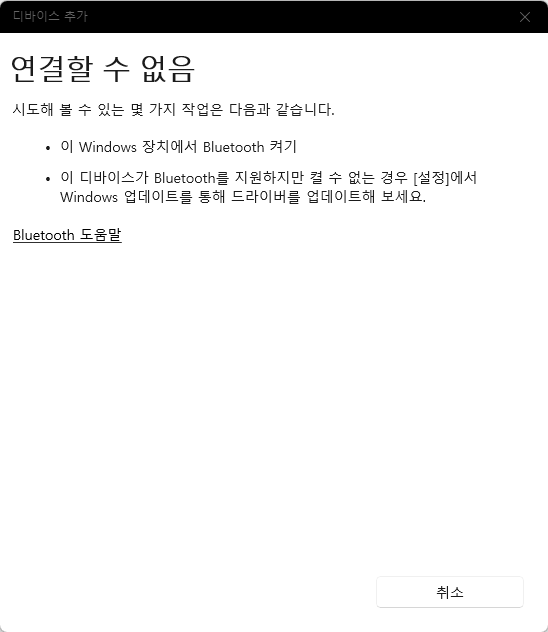 하지만 필자처럼 아예 블루투스 기능을 사용하지 못하는 경우, 위와 같이 나옵니다.