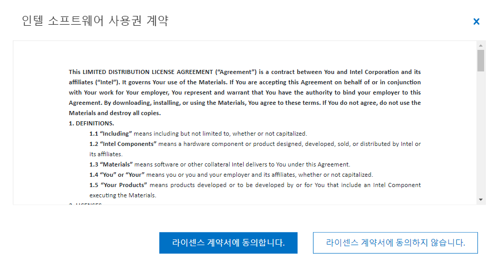 하단의 '라이센스 계약서에 동의합니다.'를 클릭하면 설치 파일이 다운로드됩니다.