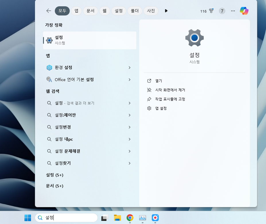 윈도우 검색창에 '설정'이라고 입력하고, 제일 먼저 나오는 앱을 실행해주세요.