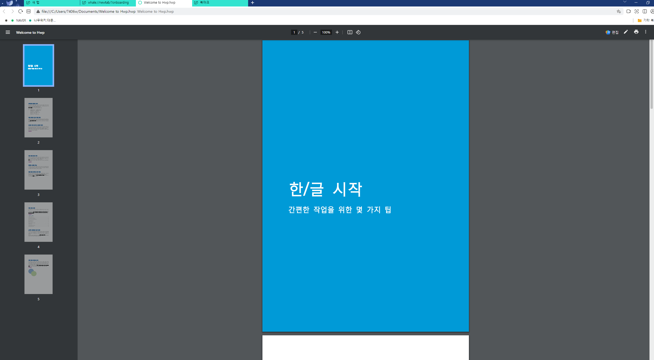 대신에 웨일 브라우저가 있습니다. 웨일에서는 PDF처럼 한글 파일을 열 수 있습니다.