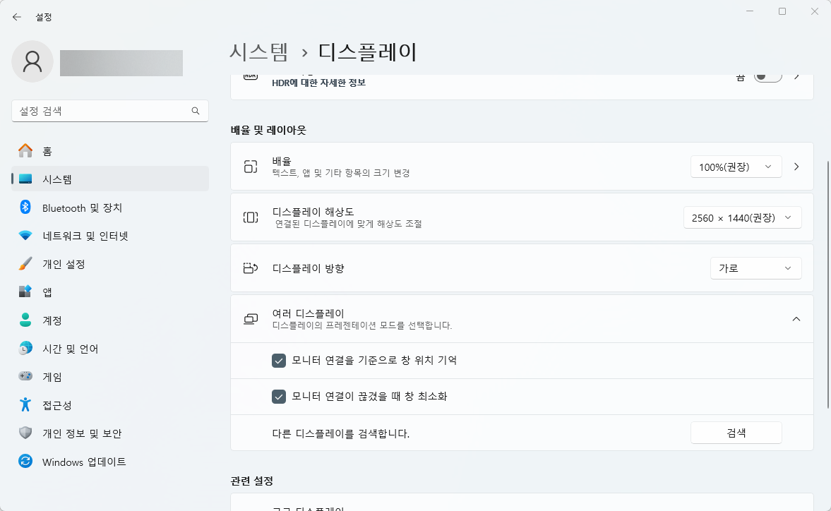 일단 여기서 모니터가 정상적으로 안 나온다면 '여러 디스플레이' 옵션을 클릭합시다.