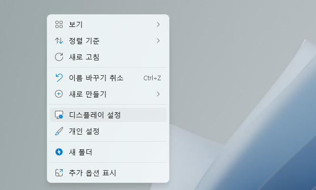 나오는 메뉴 중 ‘디스플레이 설정’ 을 클릭해주세요. (윈도우 11에서는 ‘개인 설정 > 디스플레이’ 로 바로 이동 가능)