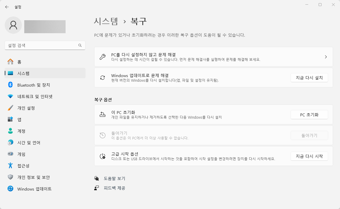 이동된 '복구'에서 하단 '복구 옵션'에 '이 PC 초기화'가 있습니다.