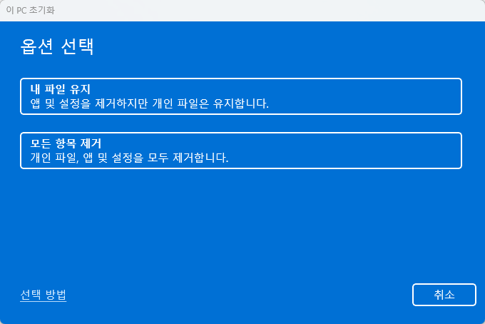 자료가 좀 많다면 '내 파일 유지'를 해도 되겠지만, 포맷의 효과를 보려면 '모든 항목 제거'가 좋습니다.