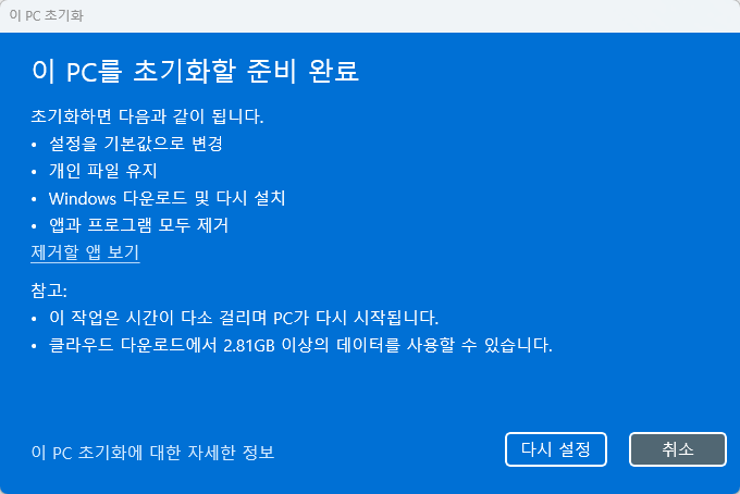 '다시 설정' 버튼을 클릭하면 이제 윈도우가 재설치되면서 컴퓨터가 포맷됩니다.