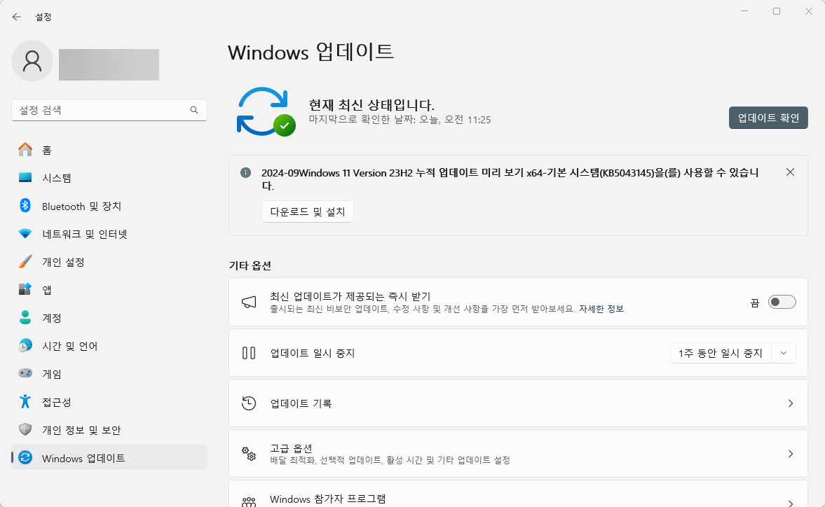 그렇게 열린 설정 창에서 좌측의 'Windows 업데이트' 항목을 선택해주세요.