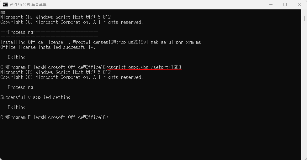 그 다음은 cscript ospp.vbs /setprt:1688를 입력하고 진행하면 됩니다.