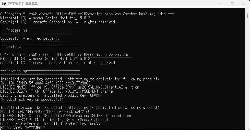 마지막으로 cscript ospp.vbs /act를 입력해서 진행하시면 키 인증이 끝납니다.