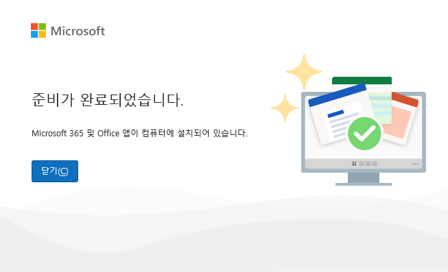 다 설치했다면 위처럼 준비가 완료되었습니다라고 나오게 될 겁니다.이제 내 컴퓨터에 마이크로오피스 365의 프로그램들이 추가된 겁니다.다만 정품은 아닌 것이죠.