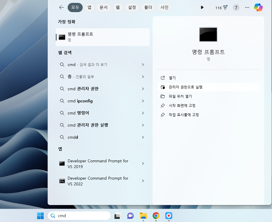 하단 검색창에 cmd 또는 명령 프롬프트라고 입력해주세요.