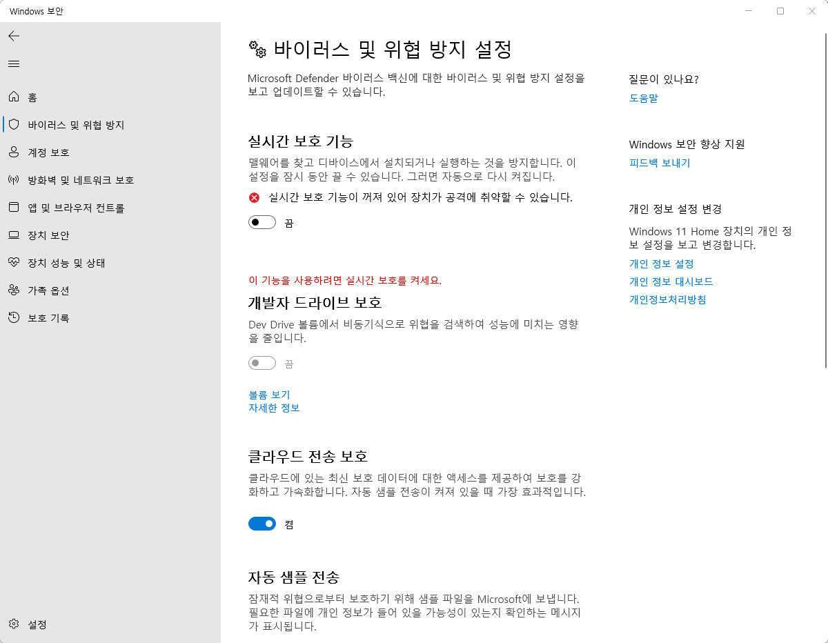 해당 기능을 끄면 개발자 드라이브 보호 기능 또한 꺼지게 되면서 위처럼 나올 겁니다.