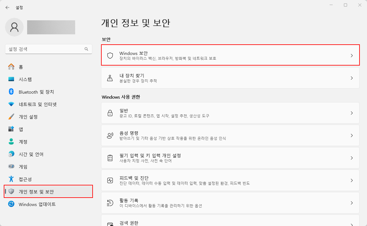 그런 다음 상단 '보안'의 'Windows 보안'을 클릭합시다.