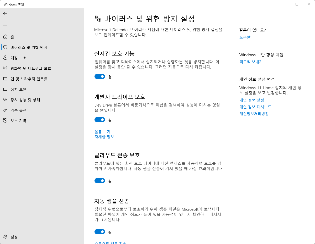 윈도우11의 실시간 보호 기능은 당연히 보안 관련 설정 안에 있겠죠.