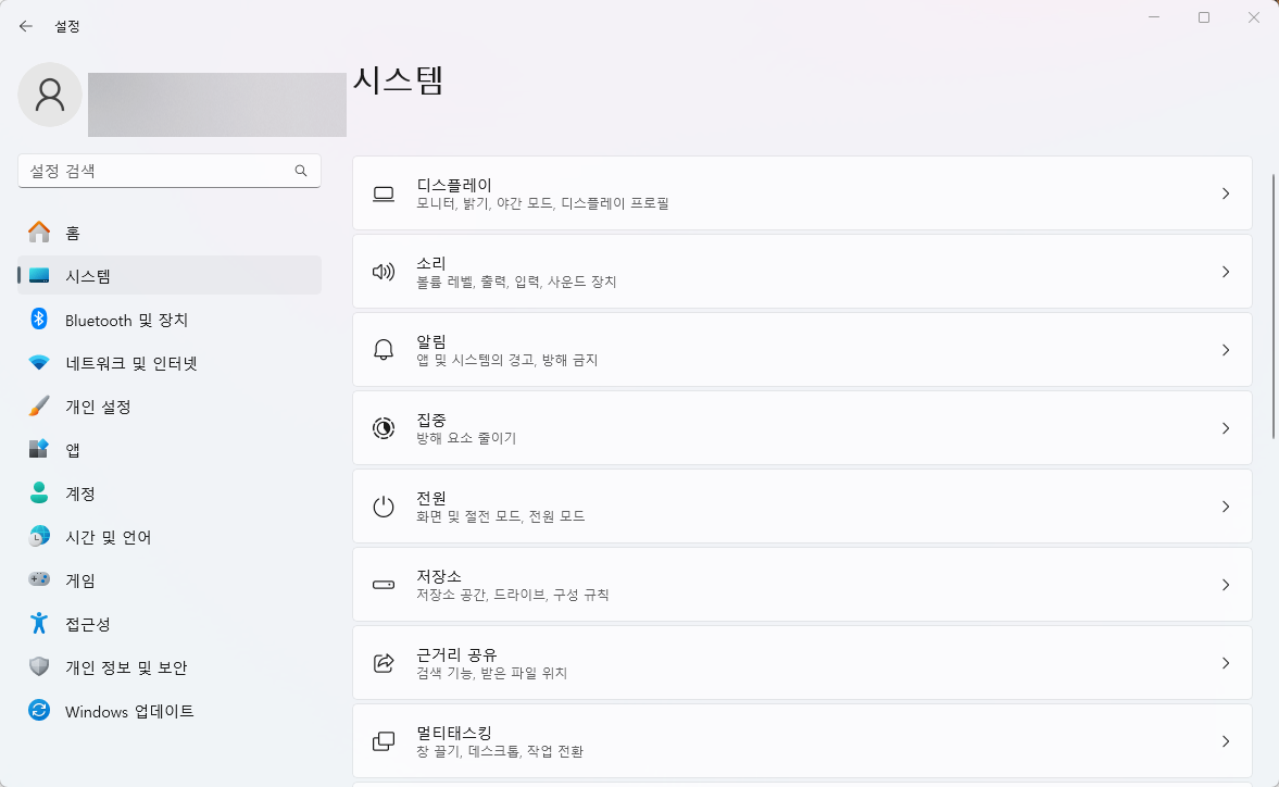 설정 창에서 좌측에 여러 옵션들이 있을 겁니다. 그 중 '시스템'을 클릭합시다.