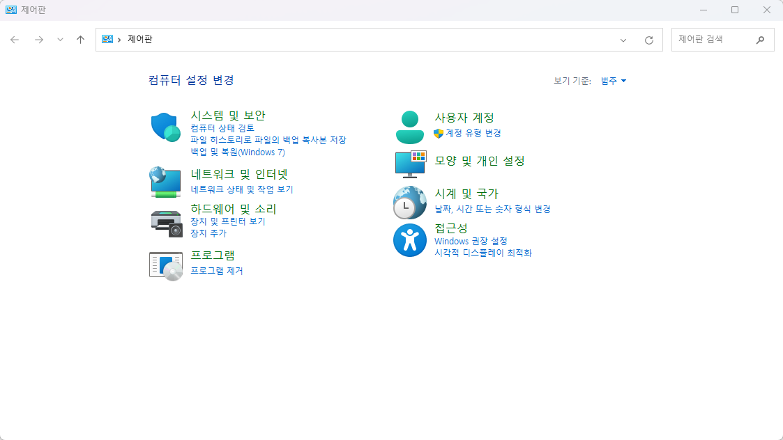 위와 같이 제어판 창이 나오면 우측 상단의 '보기 기준'을 범주로 설정해줍니다.